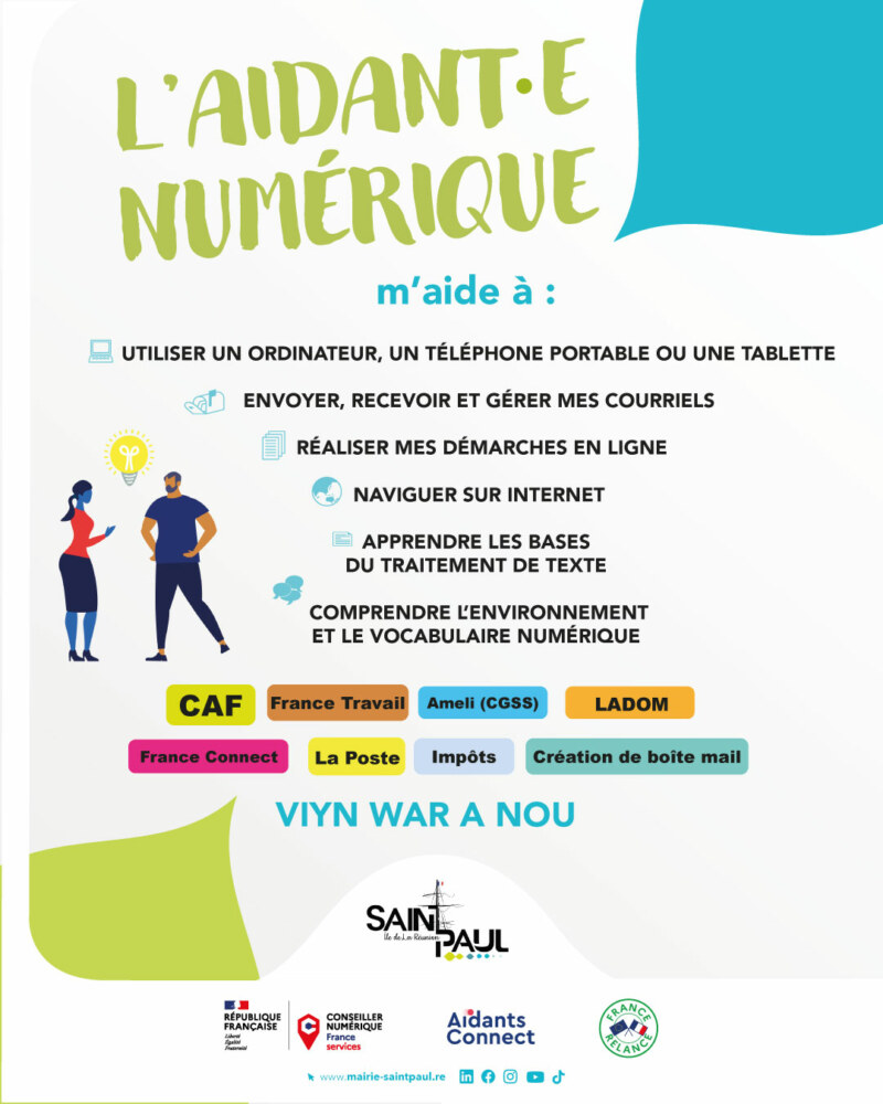 La Ville de Saint-Paul poursuit son engagement pour lutter contre l’exclusion numérique et faciliter l’accès aux droits pour tous. Des aidants numériques sont présents chaque semaine dans les différents bassins de vie de la commune, afin d’accompagner les habitants au plus près de chez eux.