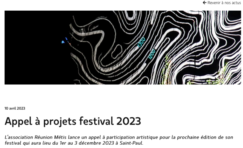 Ce 10 avril 2023, le comité artistique constitué de 12 membres (artistes, architecte, directrice artistique du festival, écrivaine, professionnels de l’événementiel et du spectacle vivant, responsable de la médiation, responsable de projet scientifique et culturel) lance un appel à participation artistique pour la prochaine édition qui aura lieu du 1er au 3 décembre 2023 à Saint-Paul ville (La Réunion) :