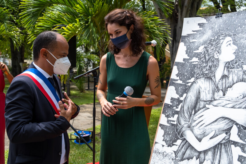 Cette illustratrice, auteure et scénariste réalise un tableau représentant une mère portant son enfant dans les bras. Cette œuvre symbolise notamment les nouvelles générations qui évoluent dans nos société teintées de modernité.