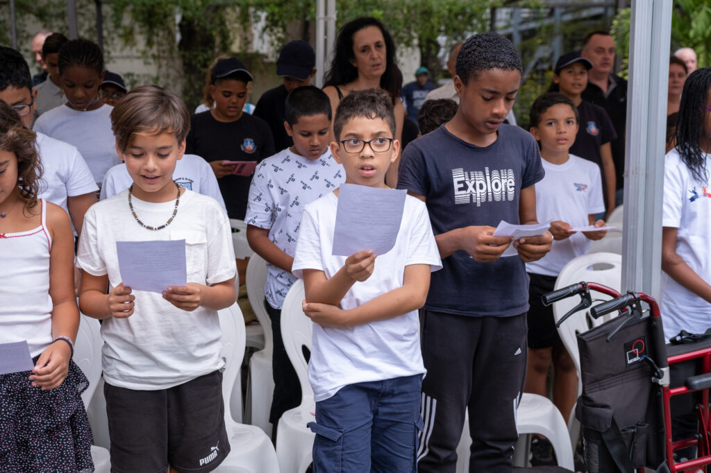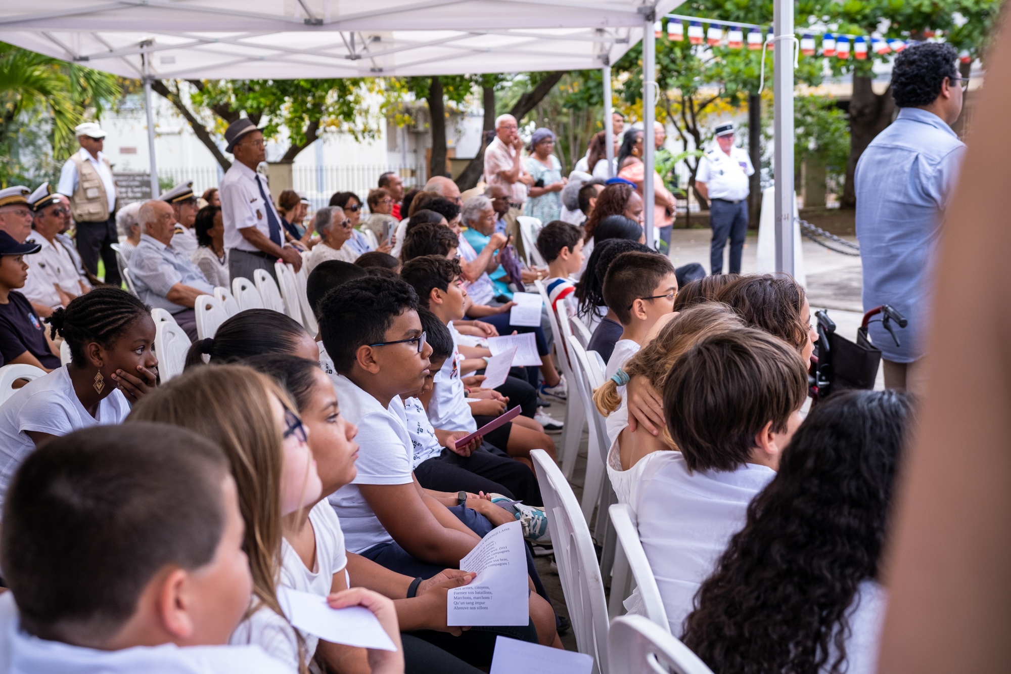 Face à lui se trouvent les visages de la jeunesse saint-pauloise, des élèves des écoles des trois circonscriptions de la commune mais aussi un collégien originaire de Mafate dont le nom de son aïeul figure sur le Monument aux morts du Jardin de la Liberté. Il s’appelait Jean LIBELLE.