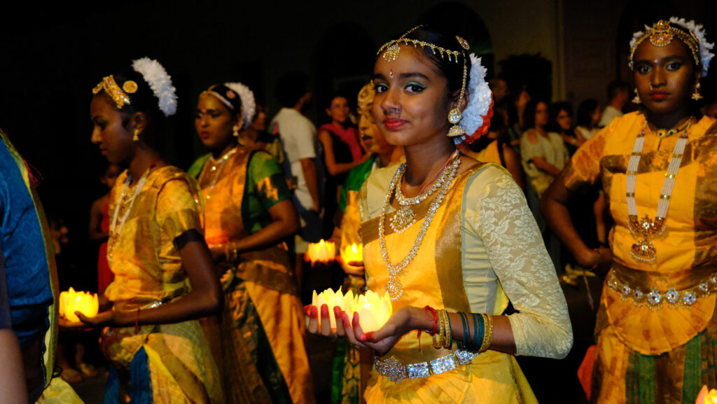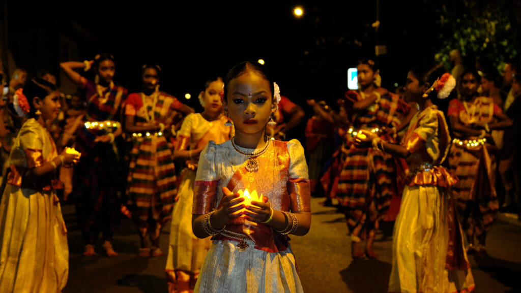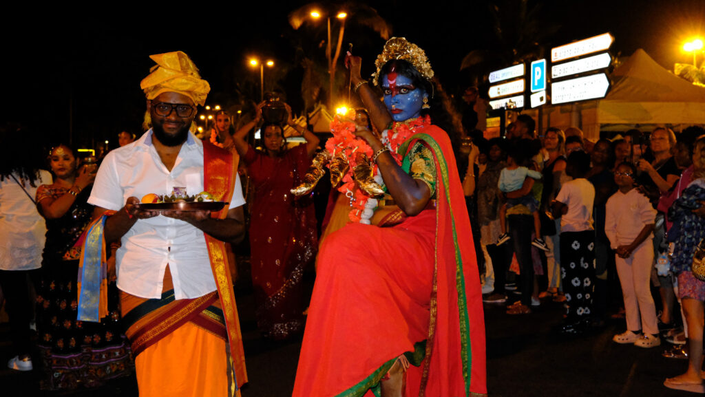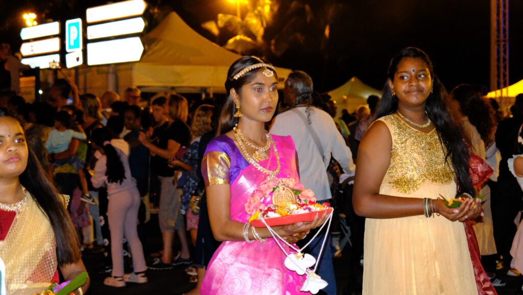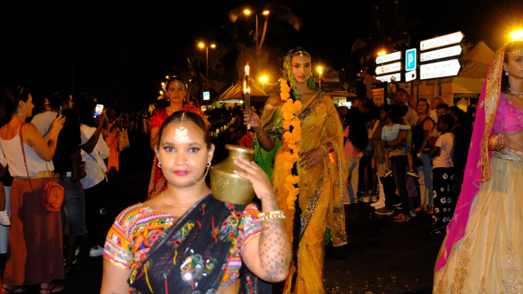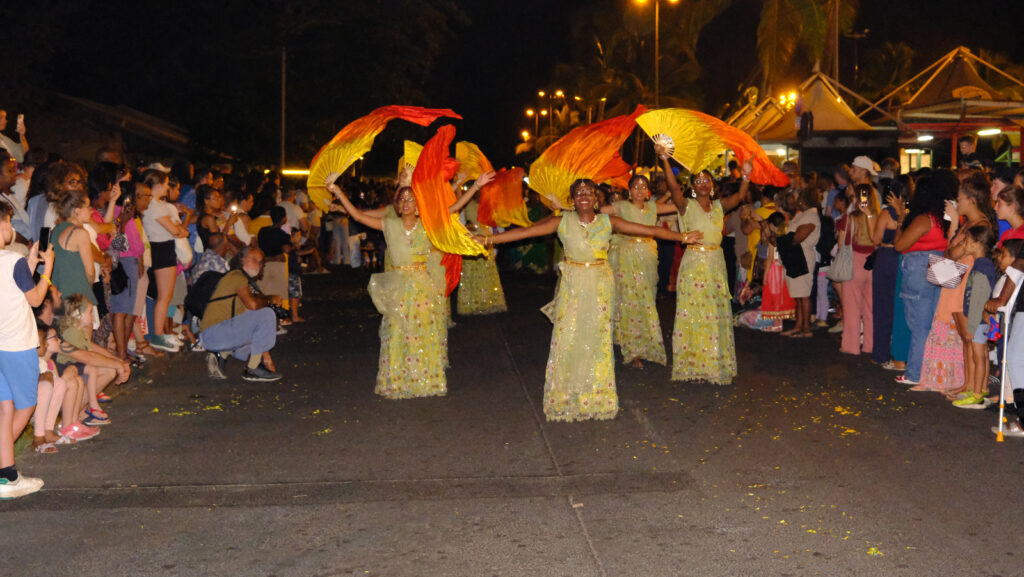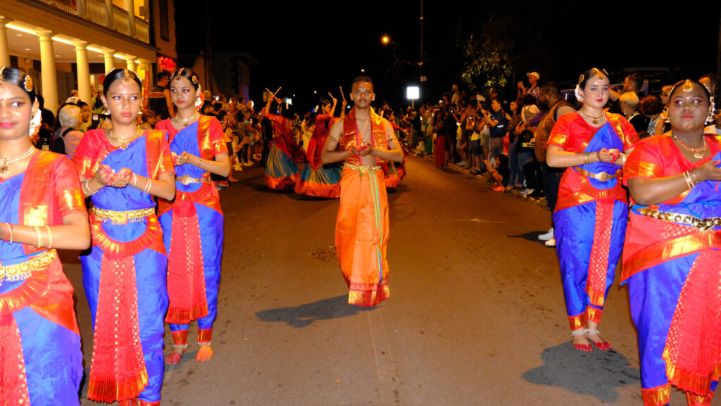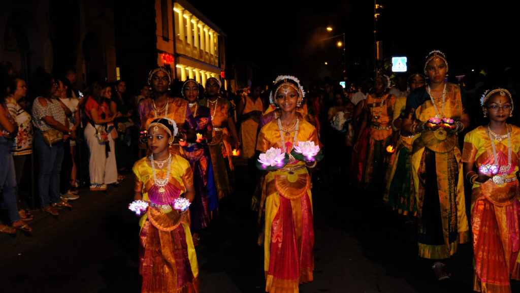 La soirée s’est poursuivie dans une ambiance musicale et festive, avant le grand défilé parti du parvis de l’Hôtel de Ville. Costumes éclatants, danses tamoules et lampes scintillantes ont illuminé la promenade jusqu’à la place du marché forain.