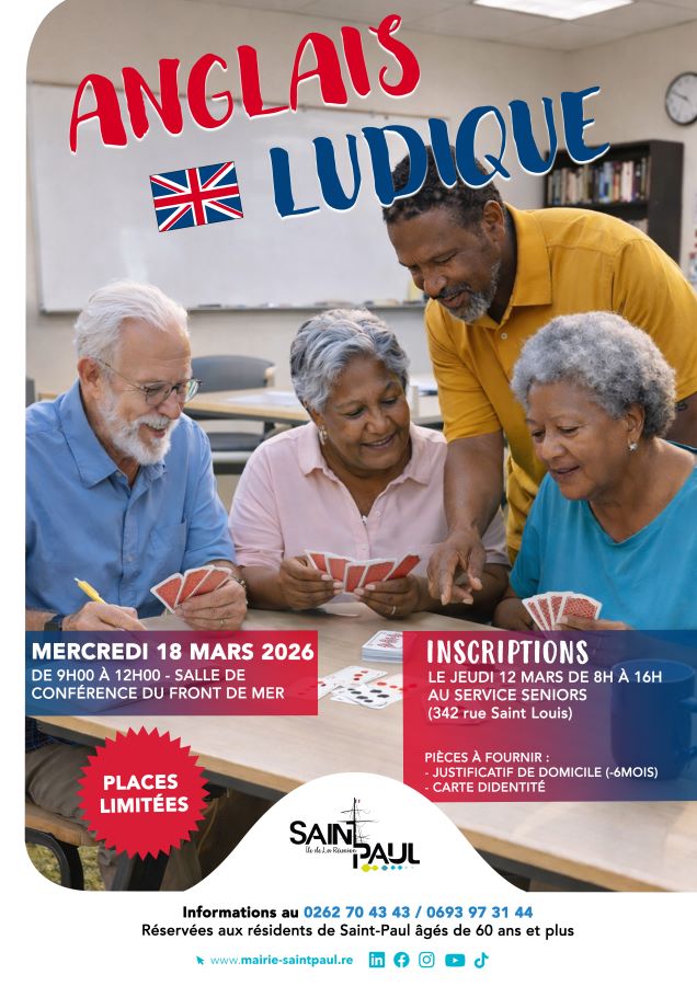 La ville de Saint-Paul propose aux séniors un atelier d’anglais ludique le mercredi 18 mars 2026, de 9h à 12h, à la salle de conférence du Front de mer.