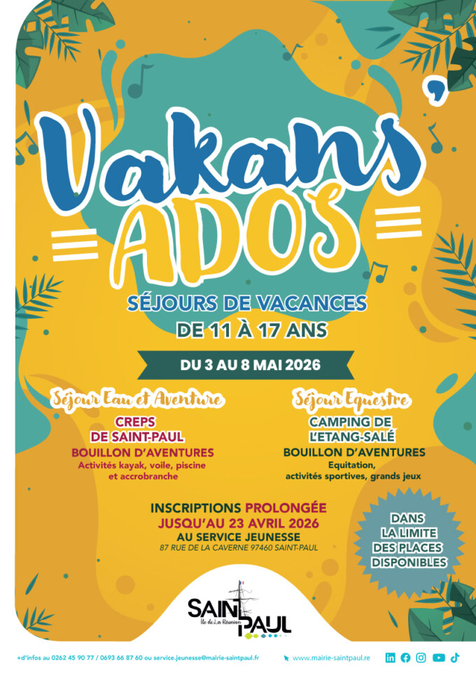 Le dispositif Vakans’Ados fait son retour à Saint-Paul pour les vacances de mai. Destiné aux jeunes de 11 à 17 ans, Ce programme propose des séjours …
