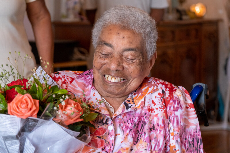 Entourée de sa famille, la gramoune qui a fraîchement rejoint le rang des centenaires de La Réunion le 3 juin dernier, est heureuse de recevoir son présent, ainsi qu’un magnifique bouquet de fleurs.