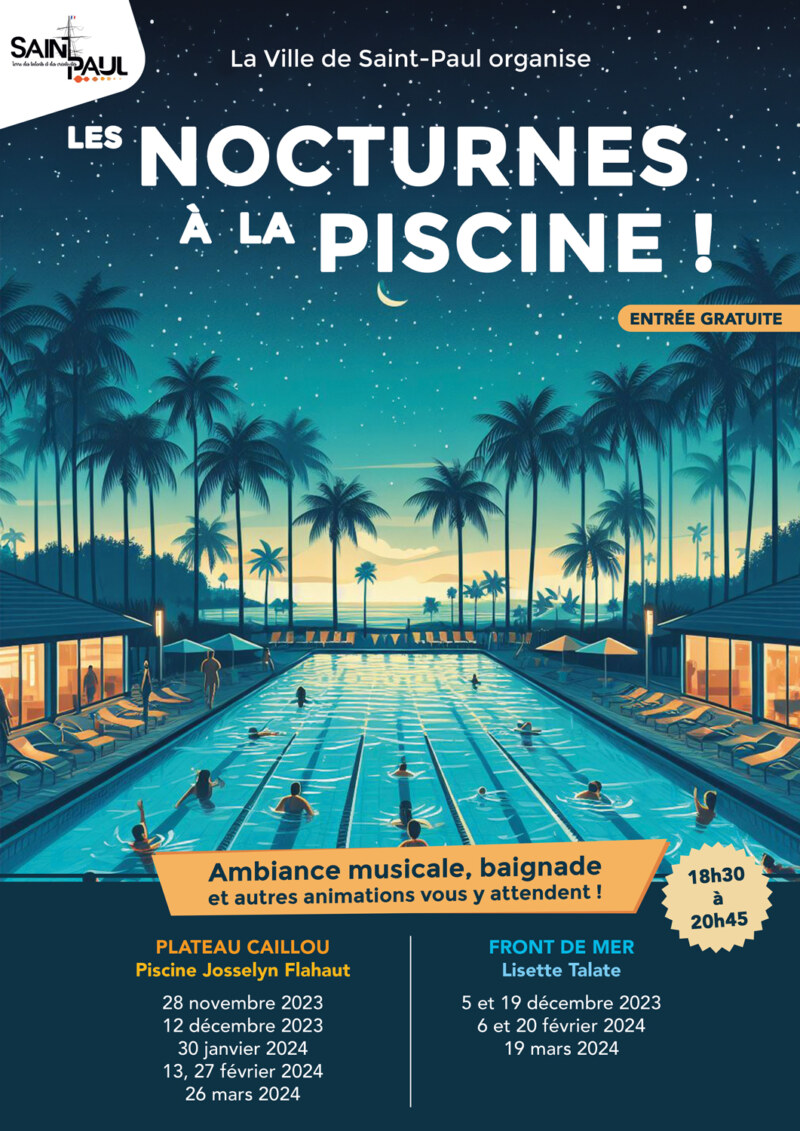 Après le succès des deux premières éditions à Plateau Caillou, plongez dans la troisième édition des “Nocturnes à la piscine” ce mardi 12 décembre à la piscine de Plateau Caillou – Josselyn FLAHAUT- pour faire le plein d’animations, avec des cours d’aquagym adultes gratuits, une initiation à l’apnée par le club APR (public exclusivement nageur), et une initiation au sauvetage côtier par le club Run West (public exclusivement nageur). Rejoignez-nous pour des moments aquatiques inoubliables !