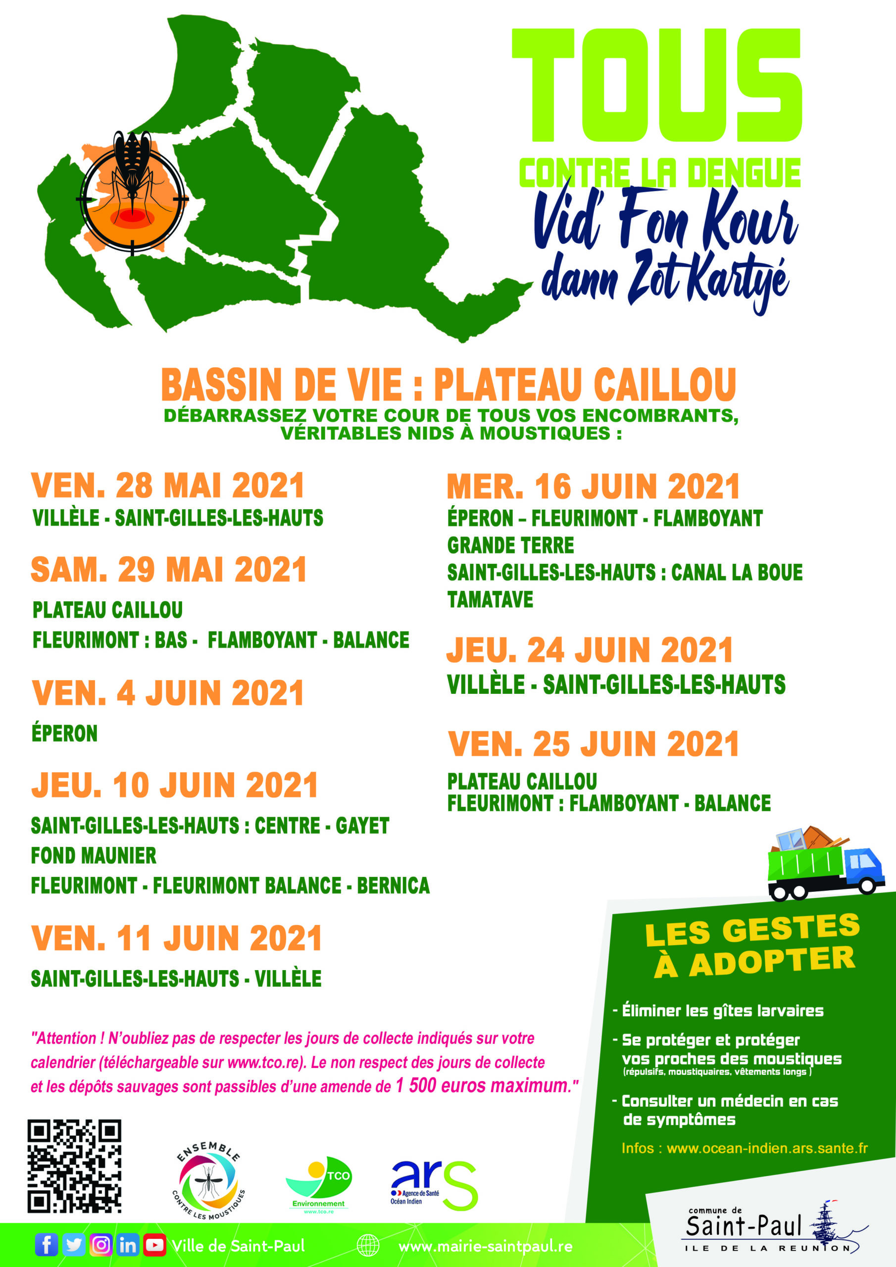 Les opérations « Vid’ fon Kour dann zot kartyé » continuent en mai et en juin dans la Commune de Saint-Paul. Tous les quartiers de Saint-Paul, dans les six bassins de vie, sont concernés par la collecte des déchets volumineux pour lutter contre la propagation du virus de la dengue.
