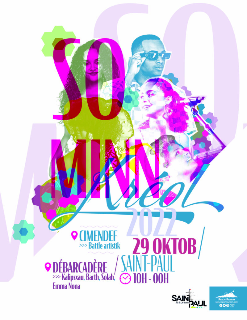Un concert gratuit se tiendra ce samedi 29 octobre 2022 sur le sable du Débarcadère à l’occasion de la Somèn kréol organisée sur le territoire de Saint-Paul, Ville d’Art et d’Histoire. Emma NONA, KALYPSAU, BARTH et SOLAH se produiront de 20h30 à minuit.
