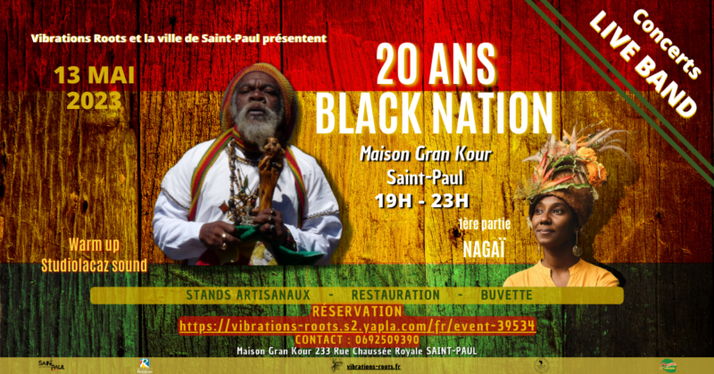 Black Nation, l’artiste talentueux de reggae roots originaire des Hauts de Saint-Paul, à La Réunion, se produira en concert pour célébrer ses 20 ans de scène le 13 mai 2023 à la Maison Gran Kour !