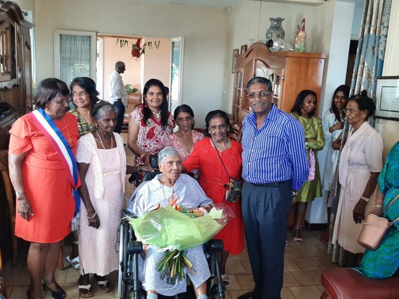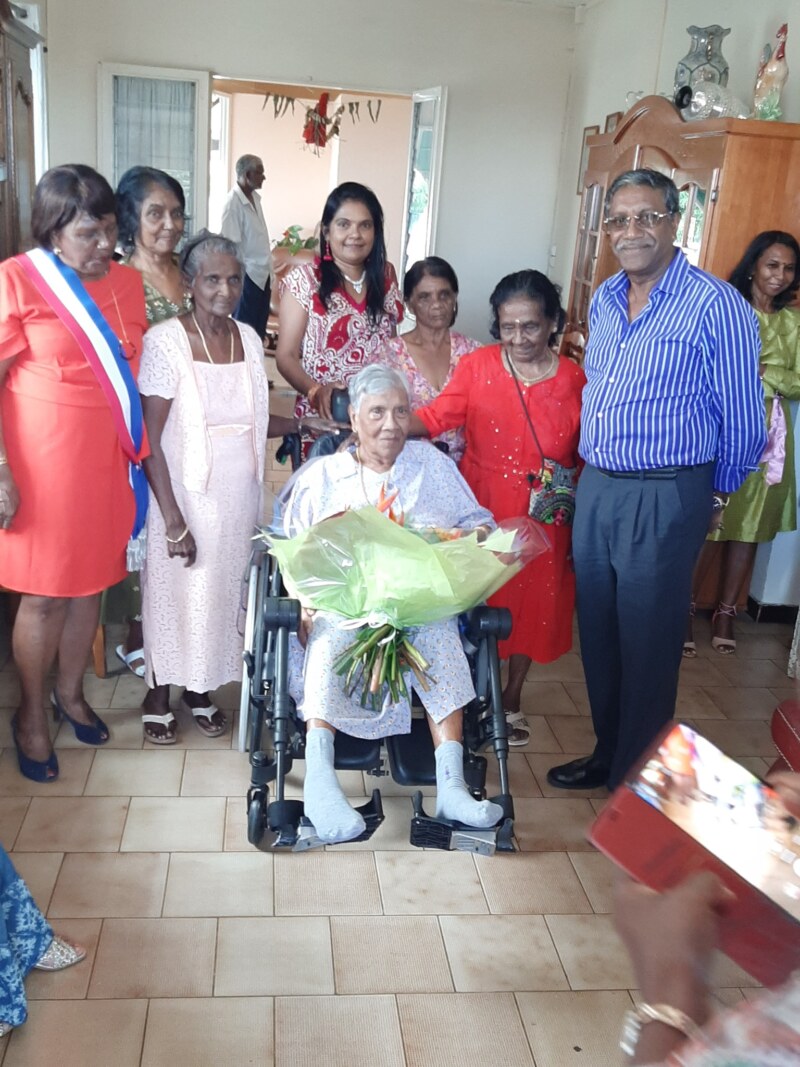 Entourée de ses proches, amis et famille, la Saint-Pauloise reçoit la visite de l’Adjoint de quartier Yann CRIGHTON et de Marie-Anick FLORIANT pour célébrer l’évènement