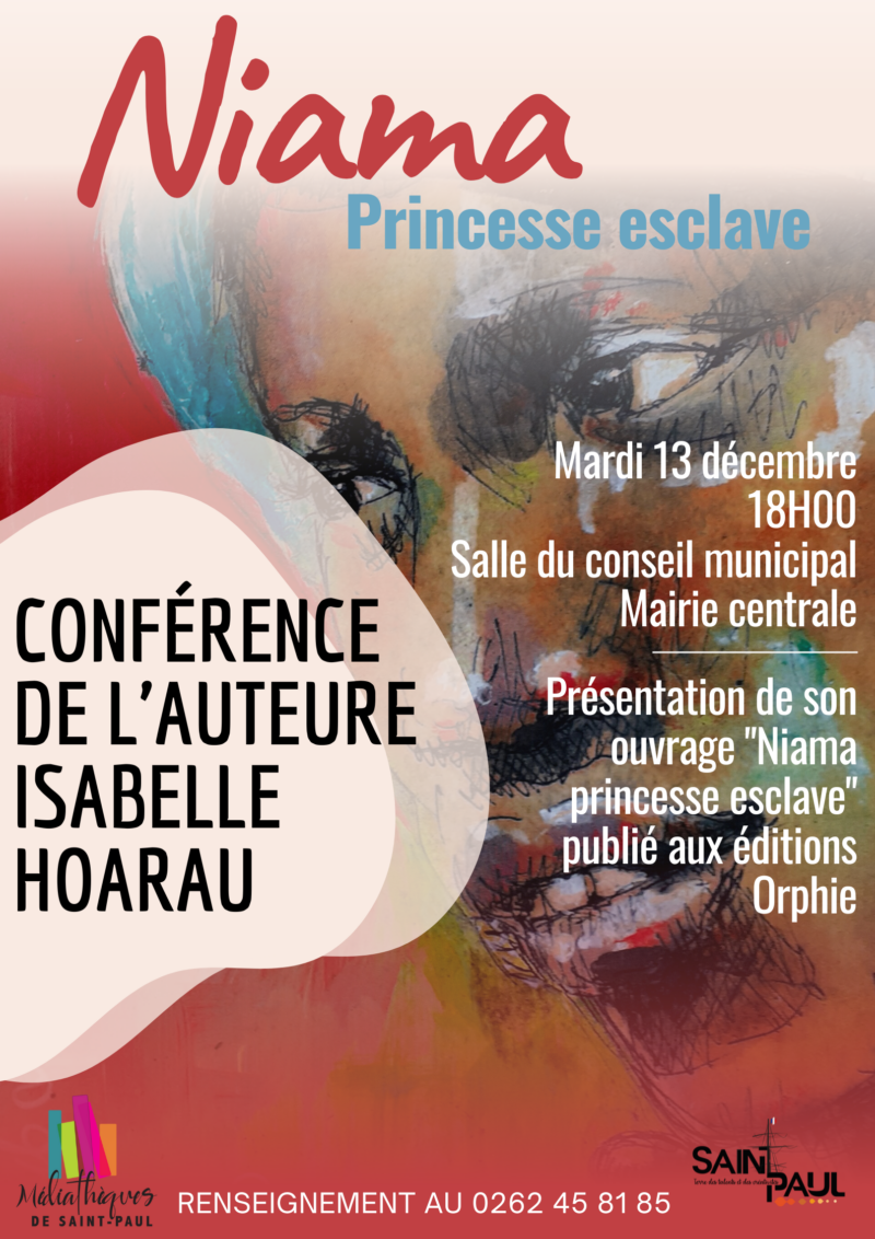 L’auteure Isabelle HOARAU donnera conférence ce mardi 13 décembre à 18h dans la salle du Conseil Municipal de l’Hôtel de Ville. Elle présentera son ouvrage “Niama, Princesse Esclave” publié aux éditions Orphie. L’entrée est libre et gratuite.