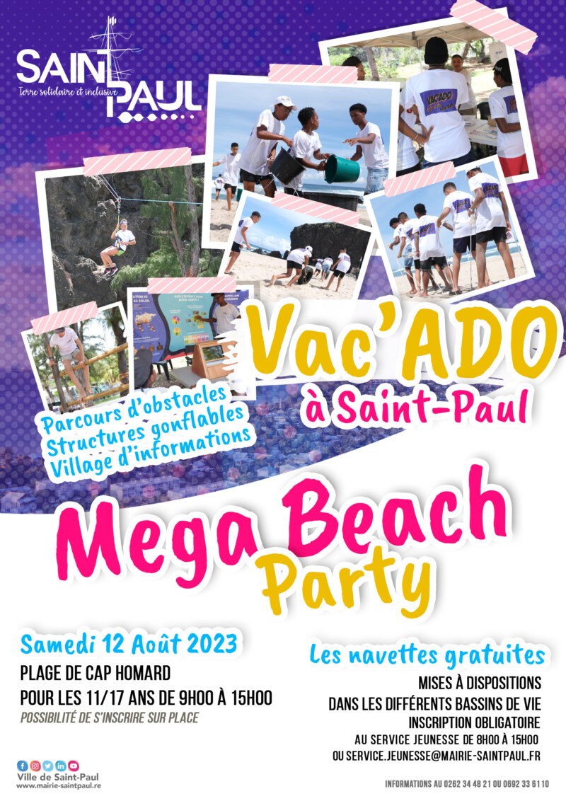 Tous les jeunes ayant participé au dispositif Vac’Ado ainsi que les adolescents de 11 à 17 ans de la ville de Saint-Paul sont attendus pour venir partager un moment festif et profiter de la fin de ces vacances avant d’entamer une nouvelle année scolaire. Parcours d’obstacles, structures gonflables et bien d’autres activités sont au programme.