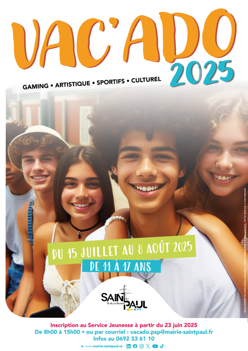 Pendant les vacances scolaires du 15 juillet au 8 août, la Ville de Saint-Paul relance son dispositif Vac’Ado à destination des jeunes de 11 à 17 ans. Une programmation riche, sportive et culturelle, pensée pour offrir aux adolescents des vacances épanouissantes et accessibles dans leur bassin de vie.