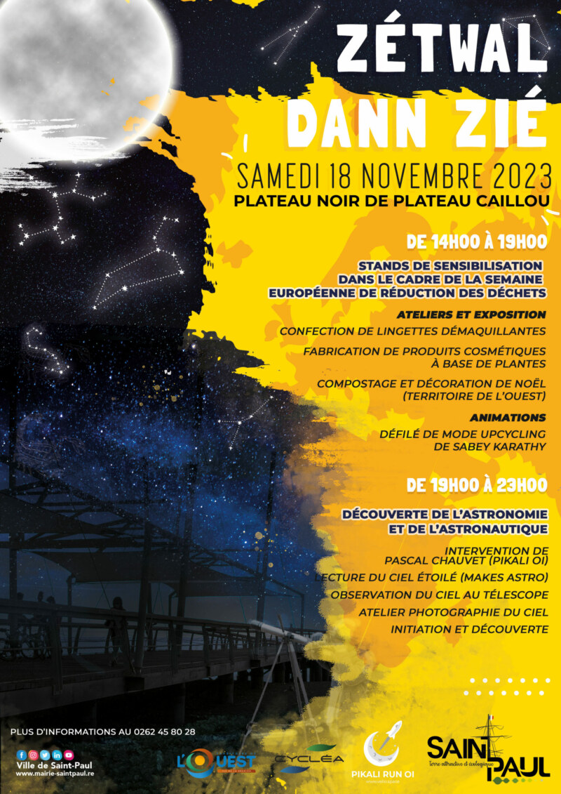 La Ville de Saint-Paul organise, en partenariat avec l’association Pikali Run OI, Cycléa et le Territoire de l’Ouest, l’événement “Zétwal dann zié” le samedi 18 novembre 2023 au Plateau Noir de Plateau Caillou. Au programme de 14h00 à 19h00 : des stands de sensibilisation dans le cadre de la Semaine européenne de réduction des déchets, divers ateliers, une exposition et des animations. Un défilé de mode upcycling de Sabey KARATHY. De 19h00 à 23h00 : partez à la découverte de l’astronomie et de l’astronautique ! Observation des étoiles et du ciel étoilé, initiation à la lecture du ciel étoilé, atelier photo du ciel étoilé… Le rendez-vous est pris, et nous vous attendons avec impatience !