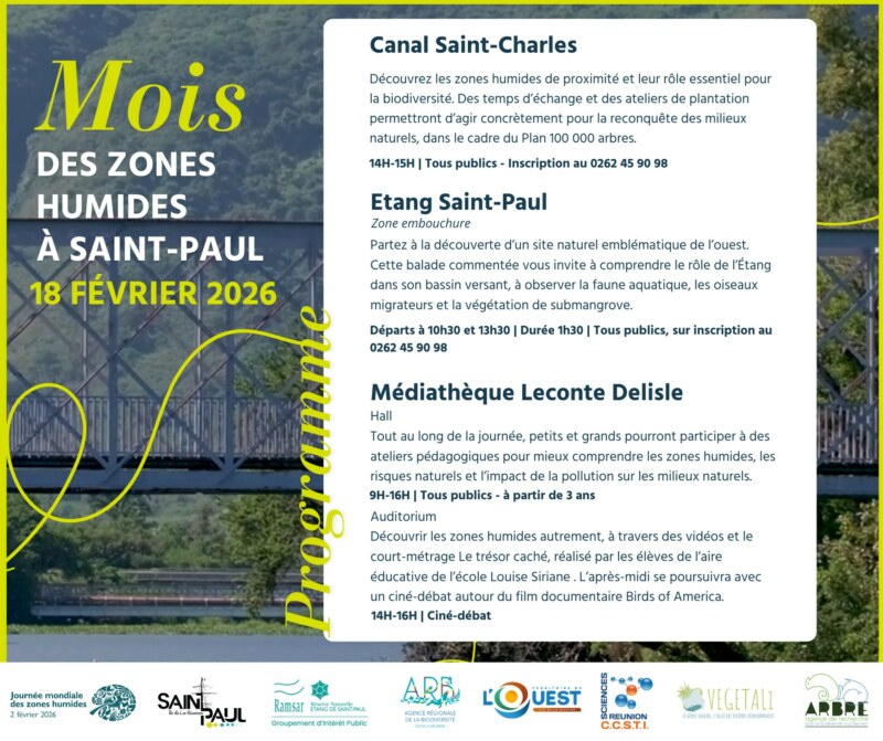 À l’occasion de la Journée mondiale des zones humides, une série d’animations, de temps de découverte et d’échanges est proposée à Saint-Paul le mardi 18 février, autour de ces milieux naturels remarquables, au cœur du patrimoine saint-paulois.